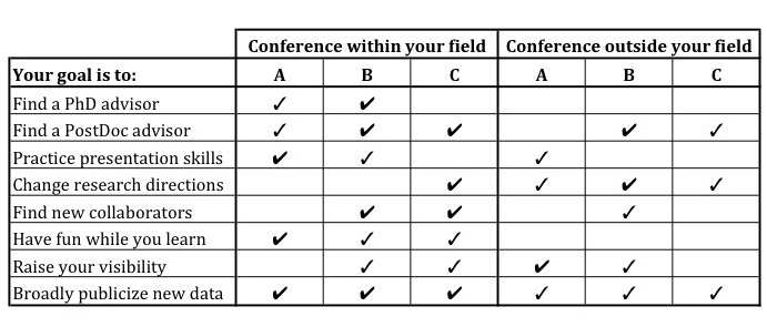 As you can see, there is no easy choice (especially if you are resource- and/or time- limited). One way to make the decision, especially if you are further on in your career, is to only attend the meetings to which you are invited, either as a plenary speaker or within a symposium. However, if you follow that track you may miss new opportunities for networking, as you are unlikely to be invited to a meeting that is outside your area of expertise. My new plan is to choose one meeting that I want to attend, one meeting that I “should” attend (i.e. based on the table below), and then one that I am invited to, unless that fills either of the two previous niches. I’ll let you know how that pans out next season.