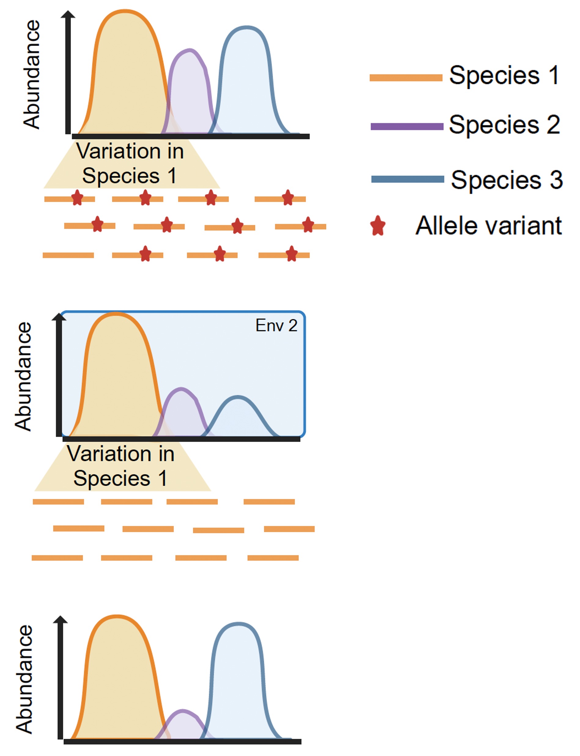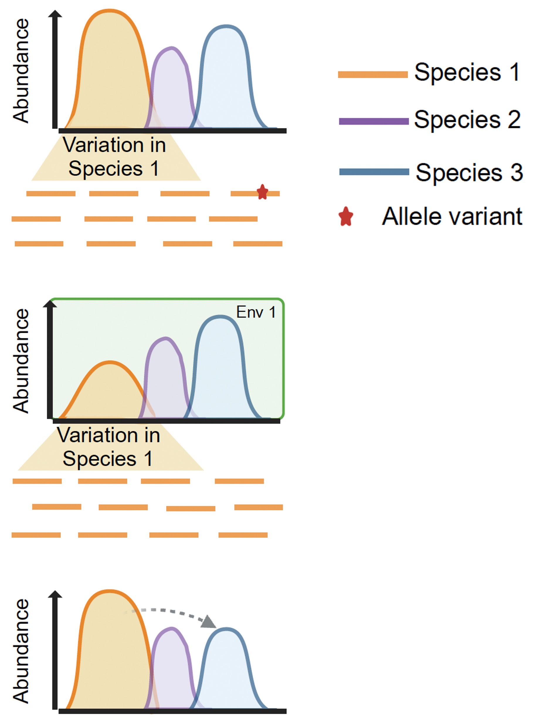 Alt text: Three panels illustrating the distribution of species abundance through time, with three colored curves in a normal distribution at varying heights. Each curve represents a separate species, the width of which captures the standing genetic variation within that species (e.g. the number of strains). When panel slider moves left to right, changes in either allelic variation or species abundances are revealed.
